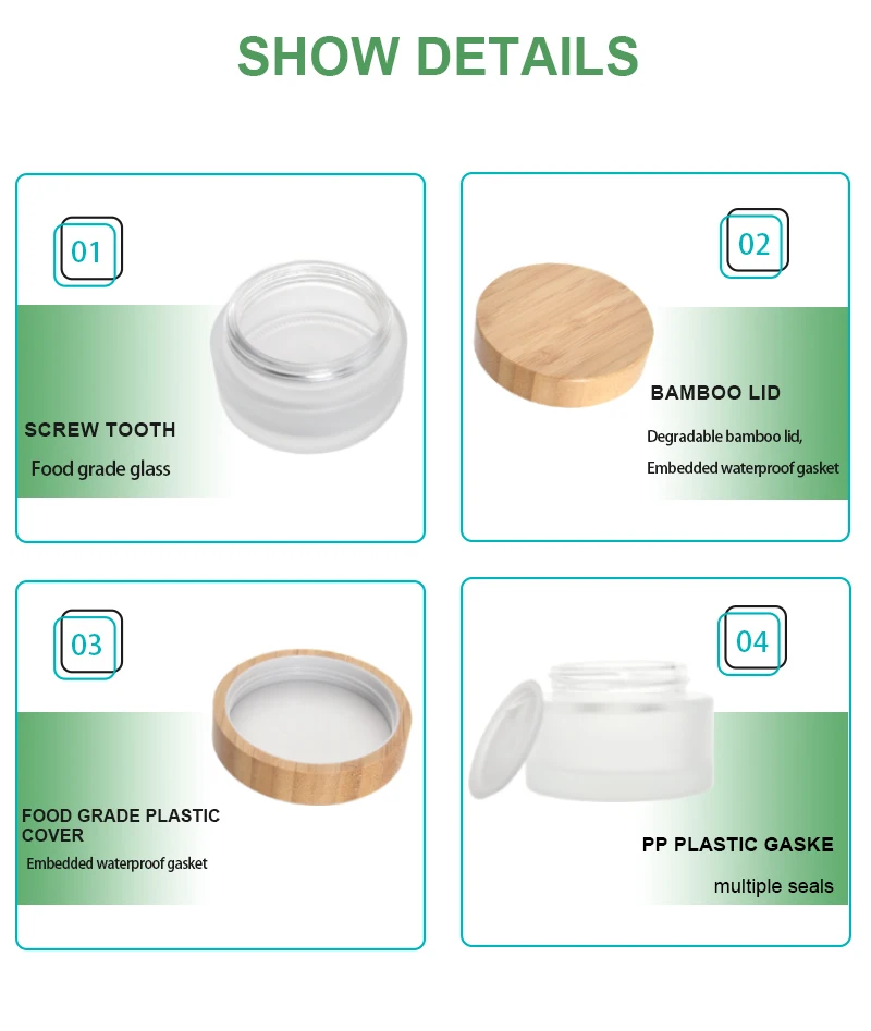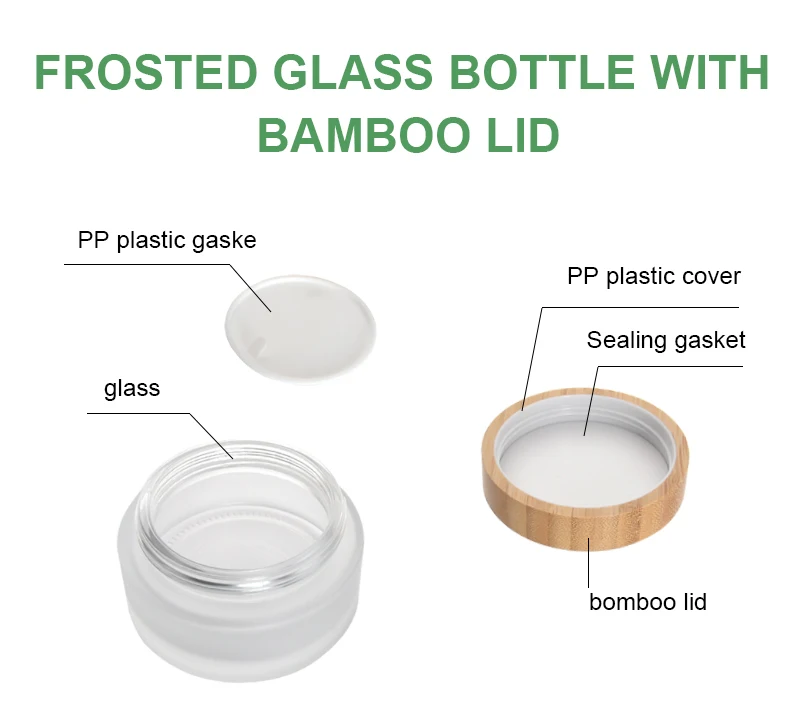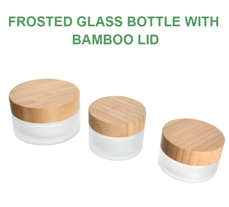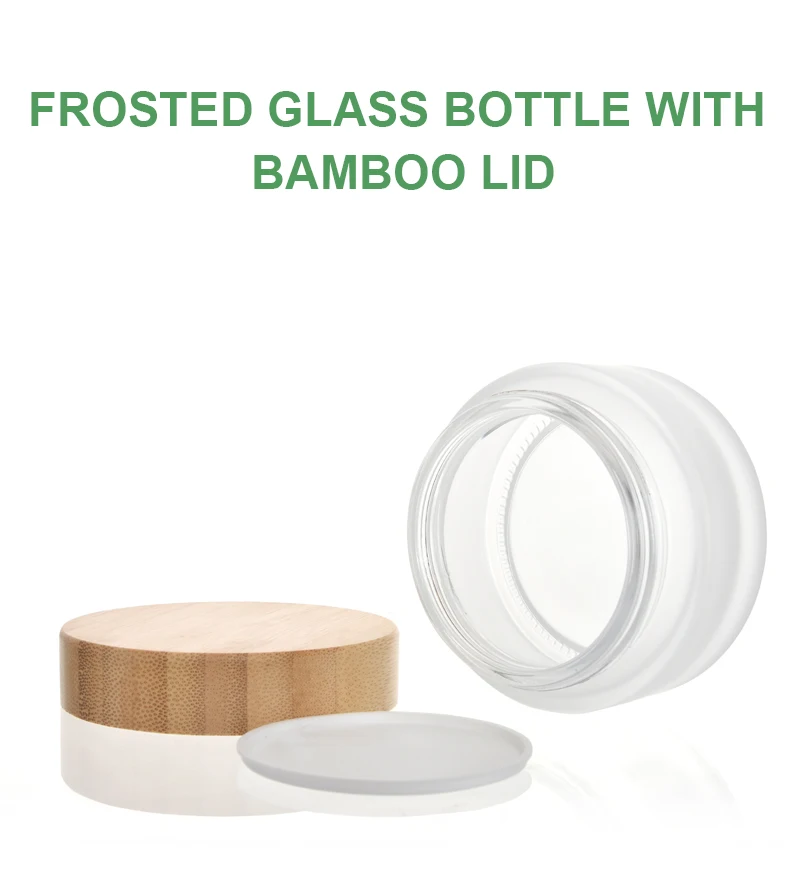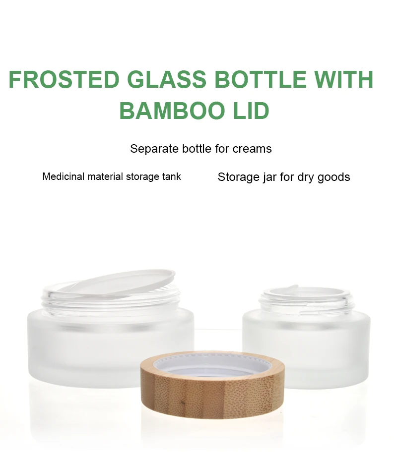 Description: luxurious eco friendly frosted cosmetic glass bottle for lotion cream with bamboo pump dropper spray lid