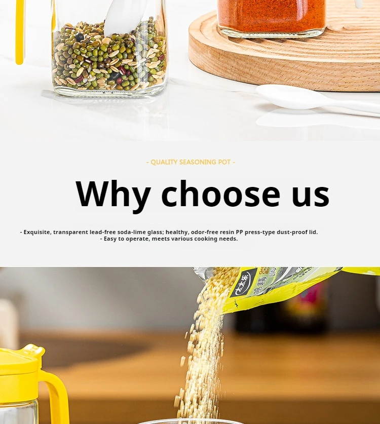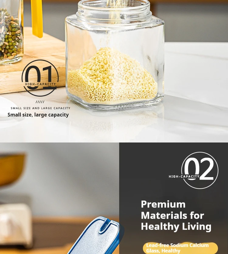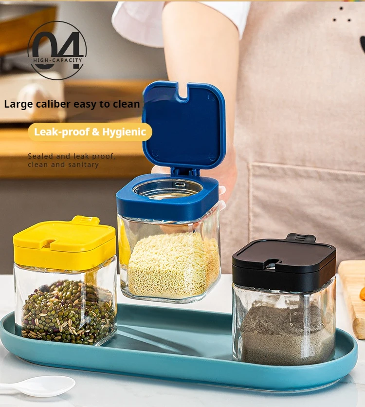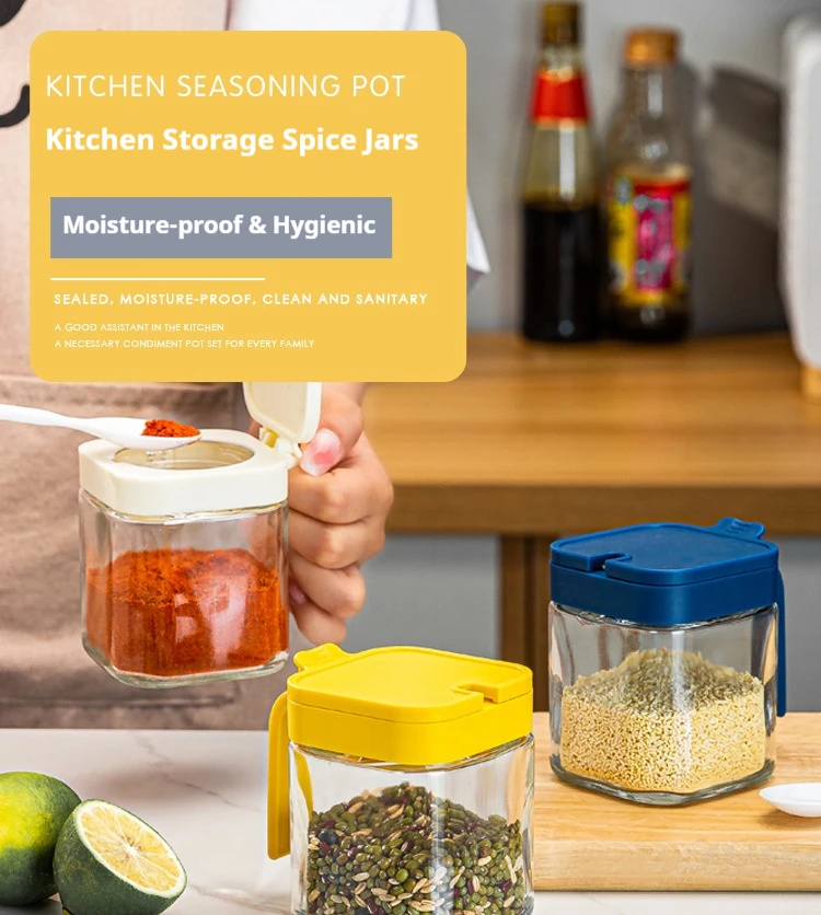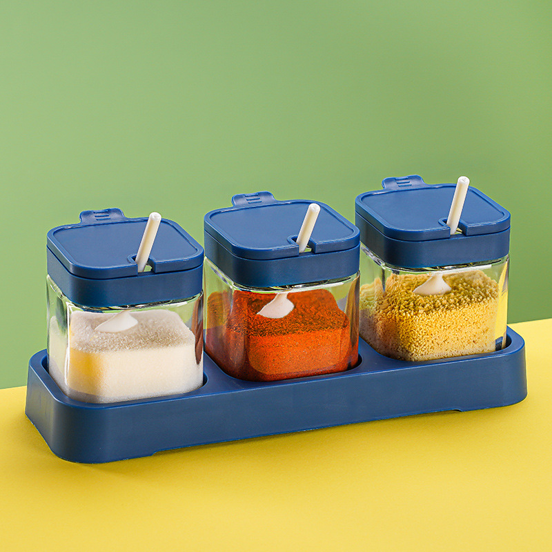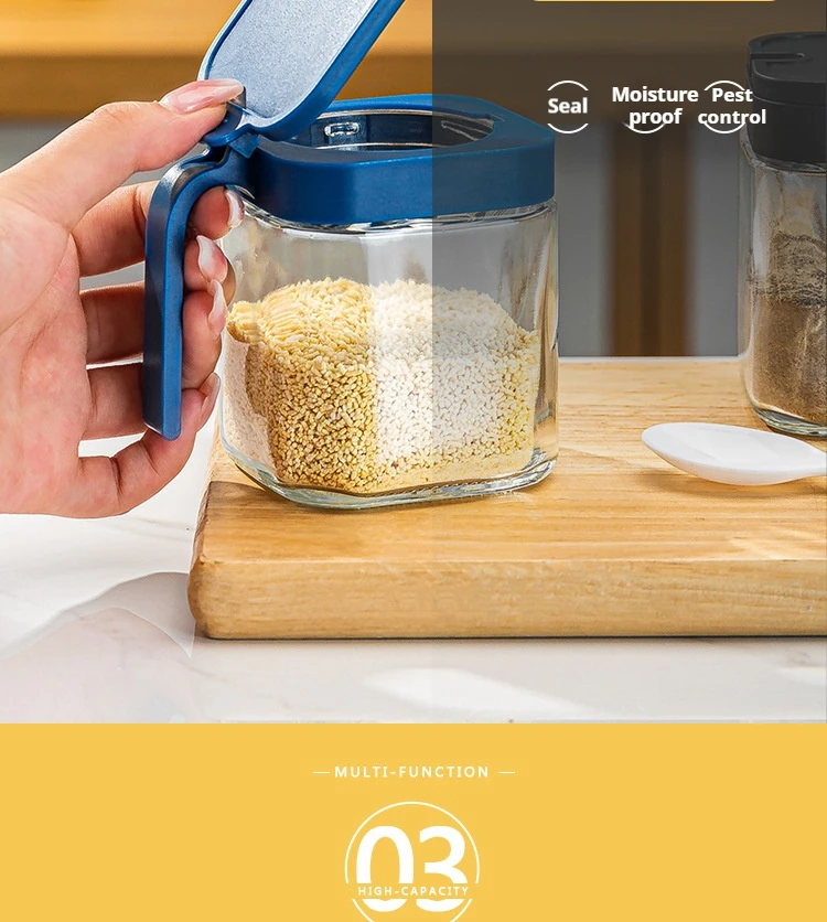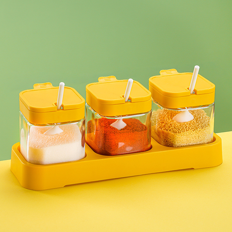 Hot Selling Factory Price Kitchen Glass Spice Storage Jar Glass Spice Bottle with Spoon and Lid Three-piece Set
